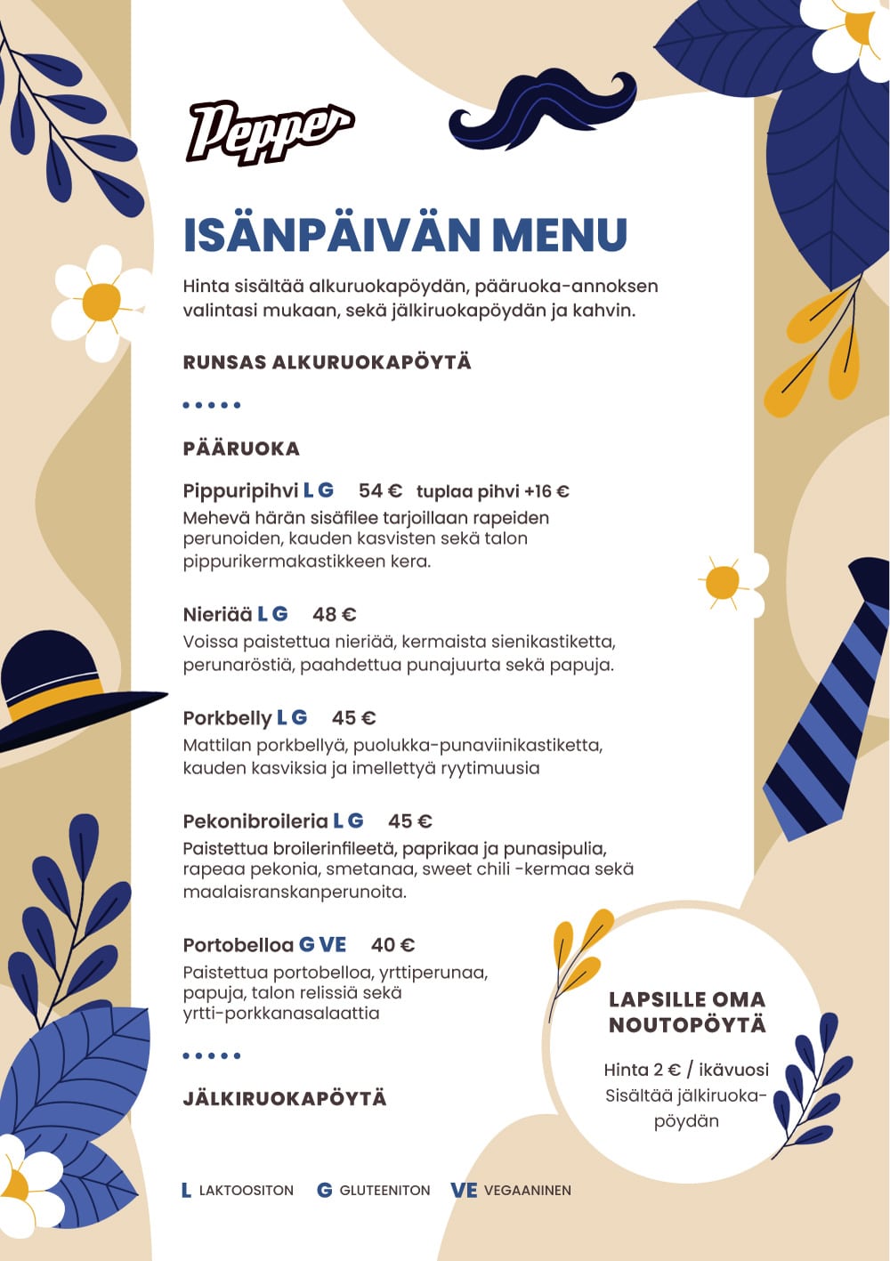 Tule juhlistamaan isänpäivää kanssamme Pepperiin, ja koe rento tunnelma ja ystävällinen palvelu. Pepperin maukkaat annokset valmistetaan vain tuoreimmista ja laadukkaimmista raaka-aineista ja isänpäivän menuun on valikoitu annokset huolella. Varaa pöytäsi nyt ja yllätä rakkaasi tänä erityisenä päivänä. Suosittelemme pöytävarausta. Tervetuloa!